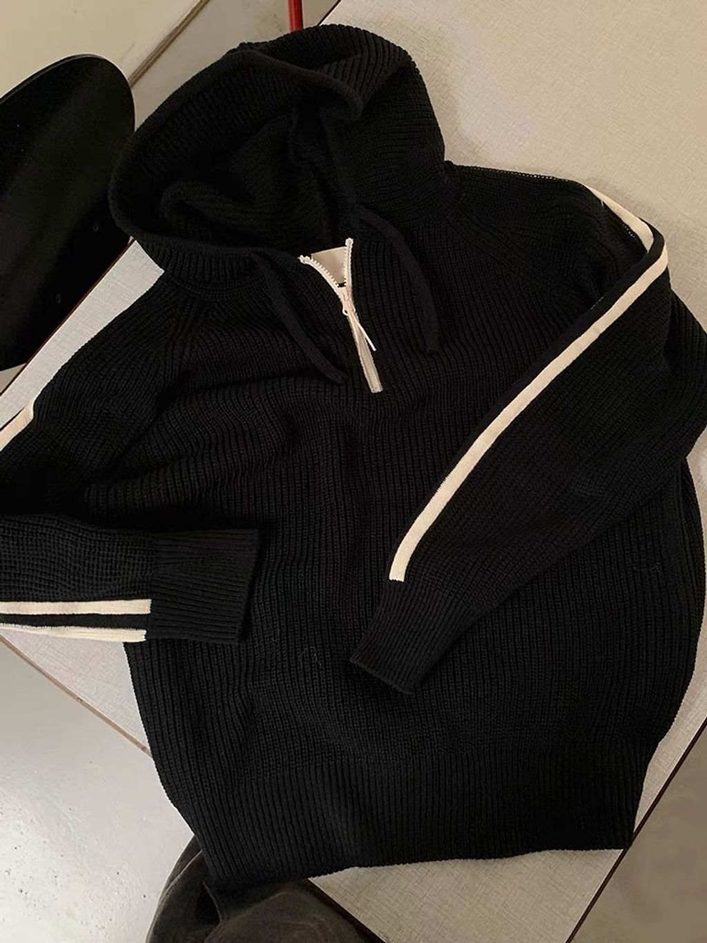 慵懶風連帽針織 秋冬季撞色半拉鍊衛衣